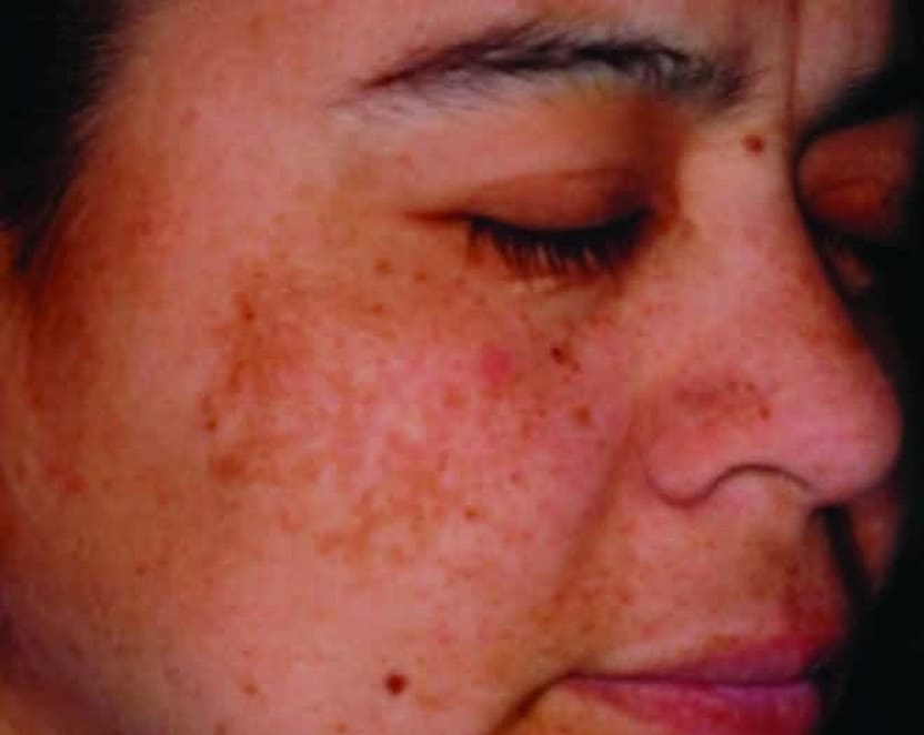 Assoziiert mit durch Sonne und Hormone stimulierte Melanozyten (erhöhtes melanozytenstimulierende Hormon (MSH)), was zu ungleichmäßigen Steigerungen des Melanins im Gesicht führt.