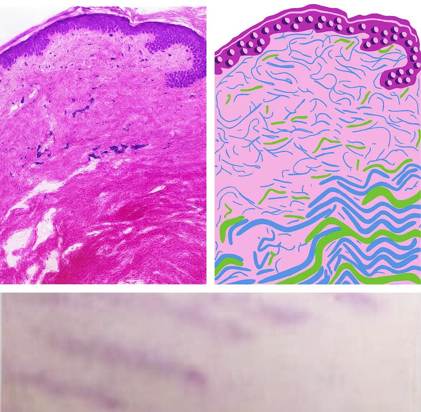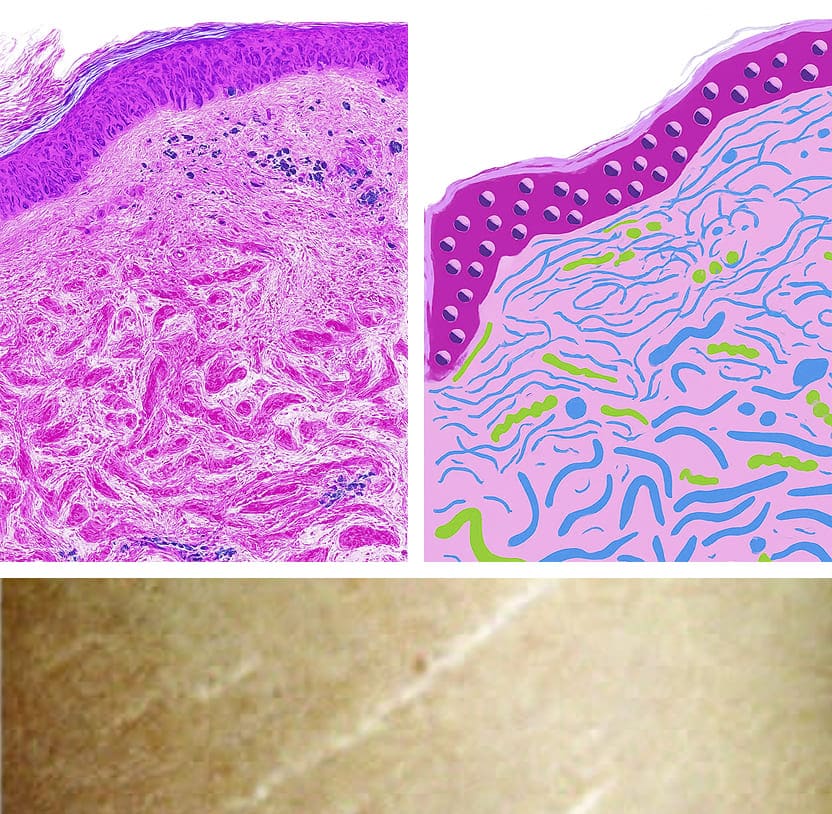 Übermäßige Kollagenablagerungen; erscheinen verdickt, aber nicht in dem Maße, wie es bei Keloiden beobachtet wird.
